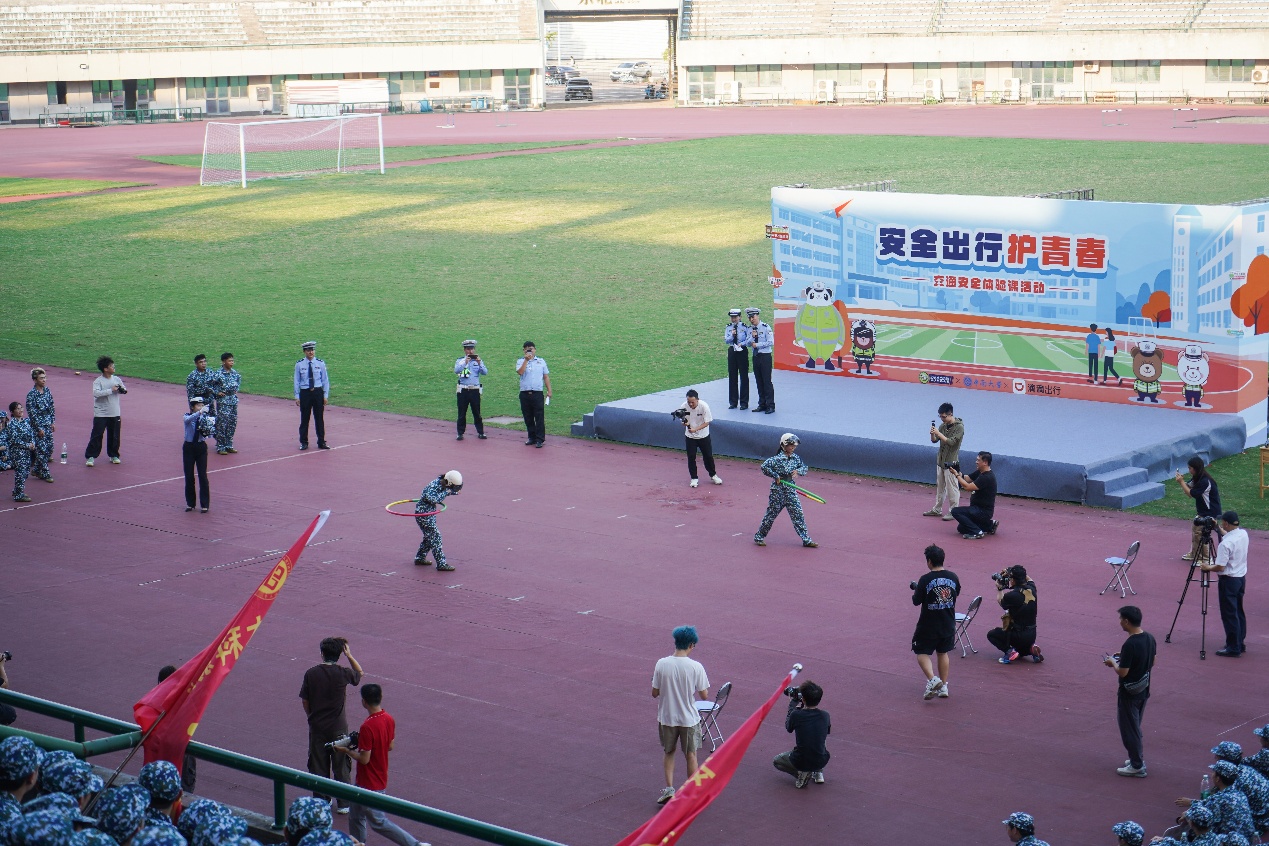 2025级本科新生军训开营仪式在潇湘校区“鸟巢体育场”举行,军训教官为参训新生进行了立正、稍息、跨立、行进等动作演示。同学们还在现场参与了“交通安全进校园”情景体验主题活动,通过交通安全主题脱口秀、洒水车视野盲区体验、交通标语你比划我猜等多样化的互动形式,积极参与学习交通安全知识,收获满满。