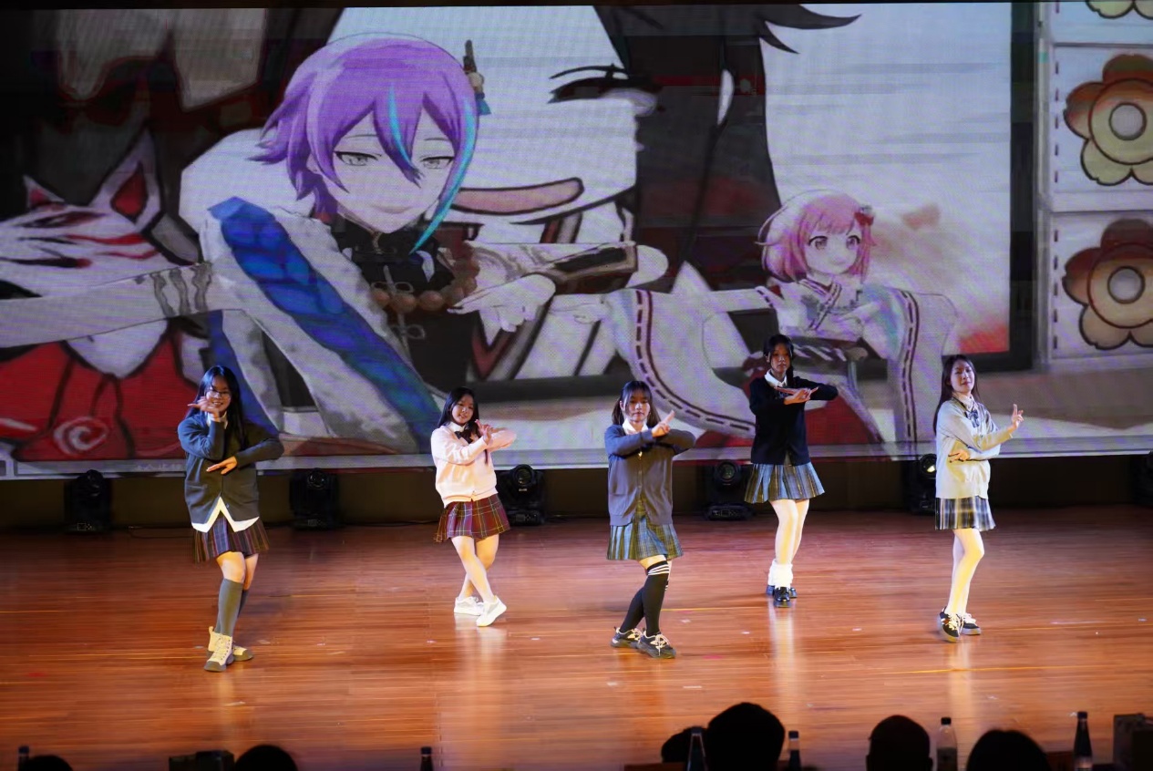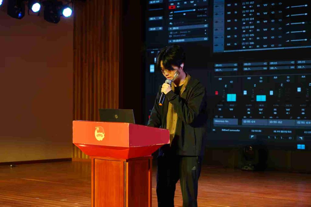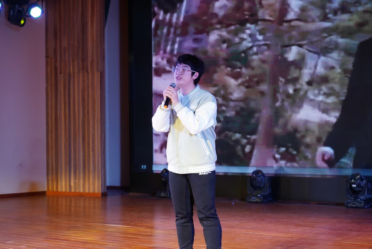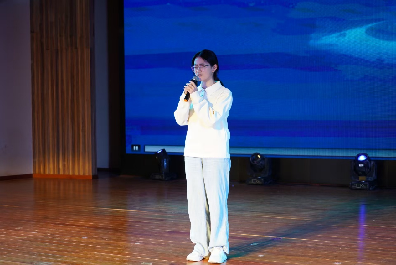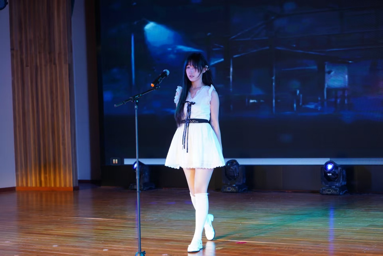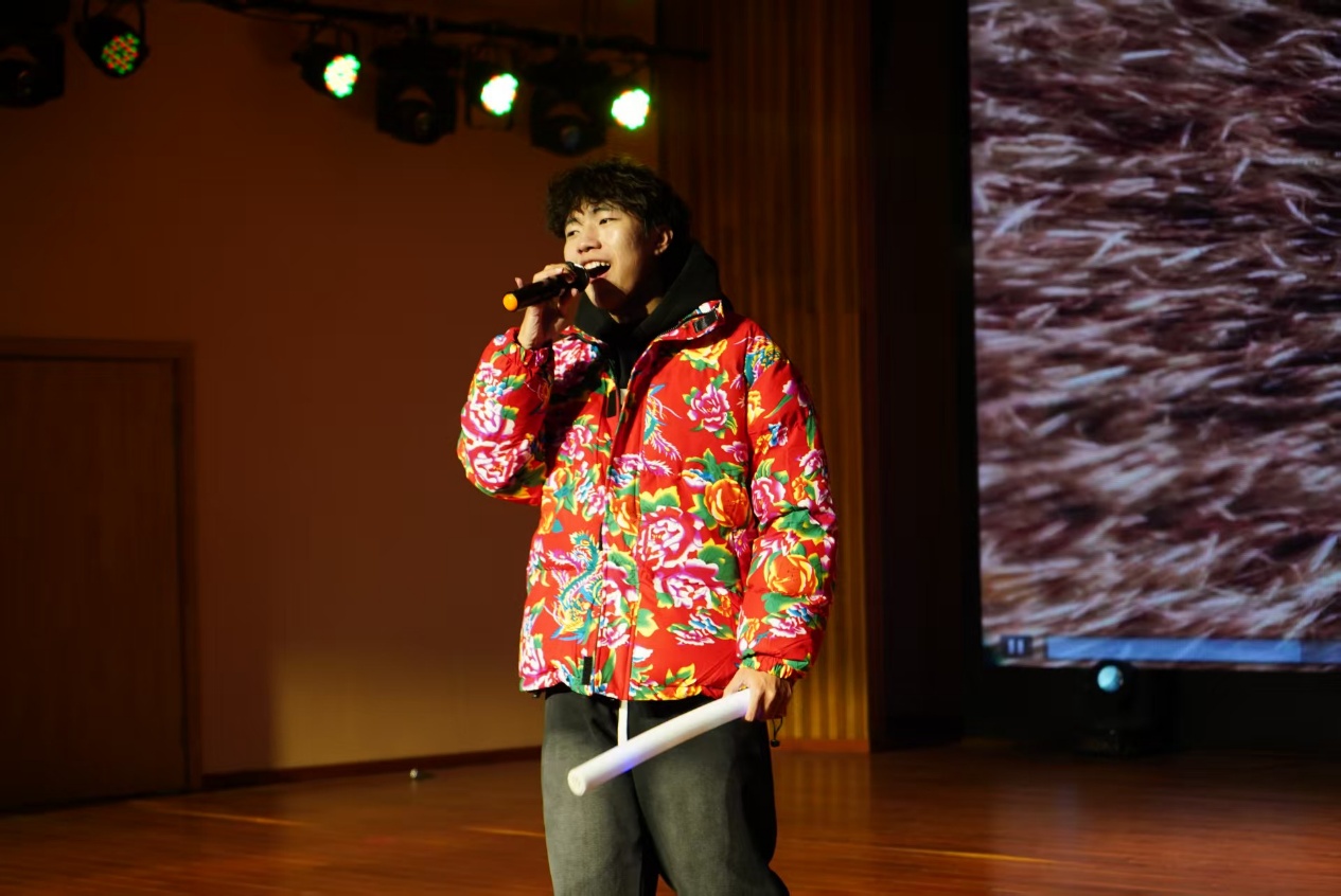 首轮互动环节的趣味猜歌游戏过后,节目节奏愈发多元:宁帅铭的京剧《鱼肠剑》字正腔圆,尽显国粹韵味;孔禹程的《大东北我的家乡》以质朴歌声勾勒故土烟火;姚姝畅团队的舞蹈《神的随波逐流》用轻盈舞步诠释活力,舒清瑶的《下潜》则以低沉声线叩击人心。第二轮互动环节的猜动画人物挑战,让师生在欢笑中拉近了距离。