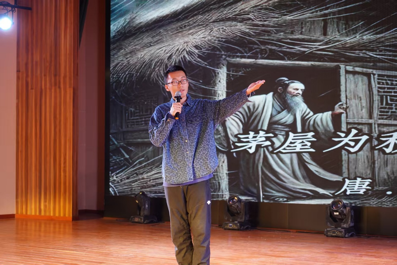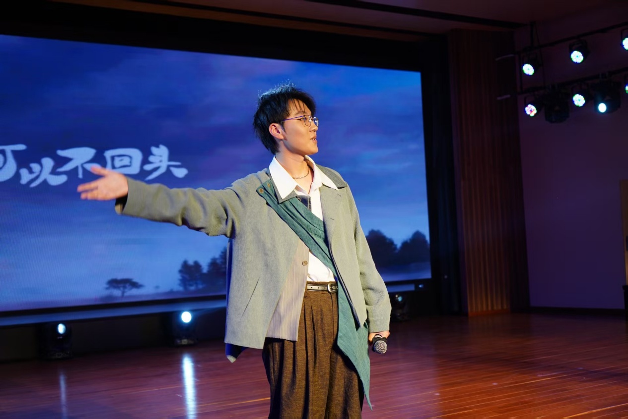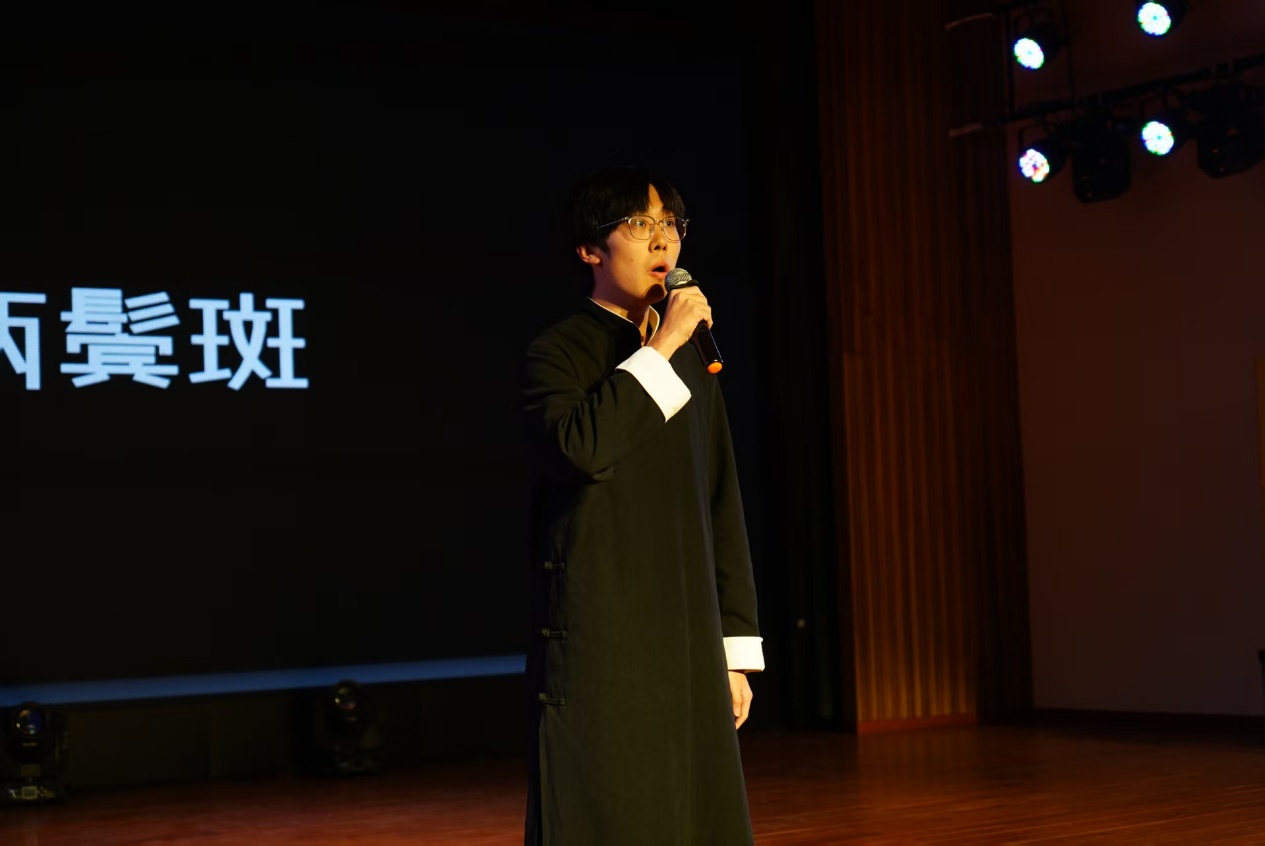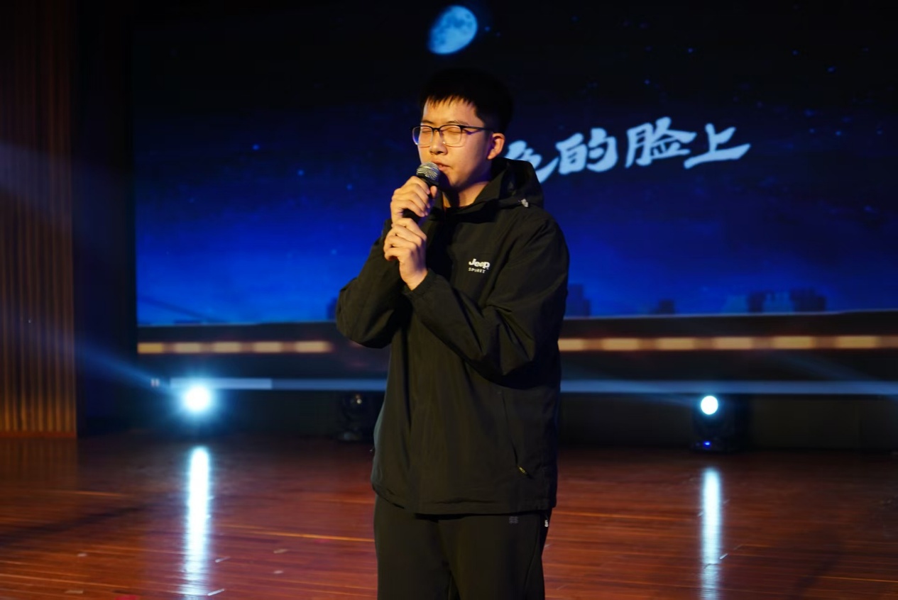 下半场的节目更显创意与深度:赵浩博、张贺然的歌曲串烧《消愁&幻听》串联起青春的迷茫与悸动;薛鑫涛的朗诵《茅屋为秋风所破歌》以铿锵语调重现诗圣情怀;李依静、李佳俊的合唱《梦一场》则用和声织就温柔篇章。