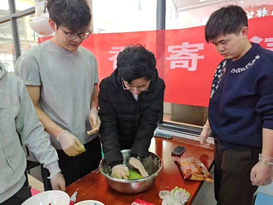 在动手制作环节,同学们分组协作、配合默契,纷纷化身“面点师”。称量食材、揉捻糯米团,再包裹上咸蛋黄、豆沙、奶黄等多样馅料,大家在工作人员的辅助下大胆尝试,发挥创意,将专业巧思融入传统美食的制作之中。指尖流转间,一个个圆润饱满、造型精巧的青团陆续成型,现场气氛轻松热烈,欢声笑语不断。制作完成的青团经统一蒸制后新鲜出炉,色泽翠绿,香气扑鼻。同学们围坐在一起,品尝亲手制作的美食,软糯香甜的口感满载春日气息。大家交流制作心得,畅谈对传统文化的感悟,在劳动成果中体会传承的意义,在互动交流中增进同窗情谊。