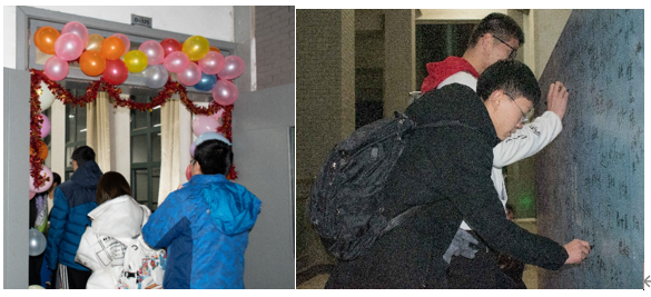 活动开始,学生们陆续走入D座教学楼,在“履行宪法义务·享受宪法权利”的成人礼背景墙上郑重地写下自己的名字,然后走过象征着成人的成人门,在领取《宪法》后进入活动会场。