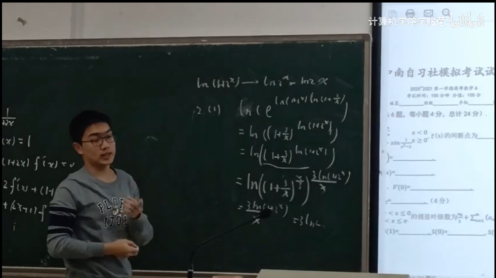 1904班的朋辈导师卓世龙主讲。导师对近两年的考题进行了“地毯式”排查,逐一分析,步步为营,既讲解了考题,又把涉及到的知识点带领大家复习了一遍。经过两次考前辅导,相信同学们对自己的信心增强了不少,一定可以去得好成绩。1月13日晚上7点,高等数学考前第一次辅导正式开讲,主讲导师是来自数统院应用数学1701班的赵启杨。赵启杨导师凭着扎实的专业知识,将之前高数模拟考试试卷分析得十分透彻。导师的分析过程思路清晰,前后逻辑连贯,板书工整,且声音洪亮,相信同学们收获一定很大,对知识点的理解会进一步加深。