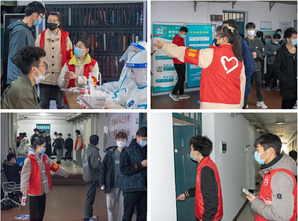 疫情防控组提前谋划,主动对接宿管站,提前布置工作任务,接到通知后立刻组建了一只40人的青年志愿者队伍,其中包括院内研究生、本科生。本次核检增添了检测点数量,采取宿舍区设点覆盖楼栋的形式进行。每个核酸检测点有一位医护人员、一位信息录入志愿者及两位学校武装部志愿者。