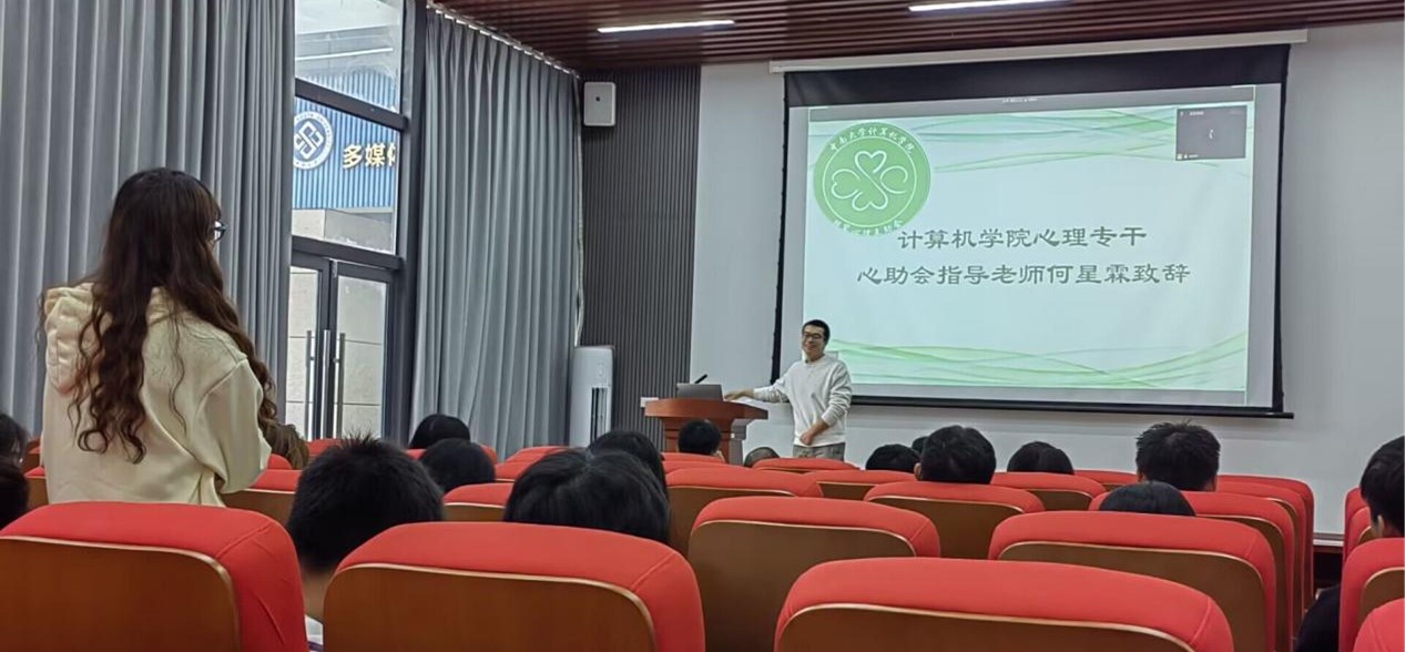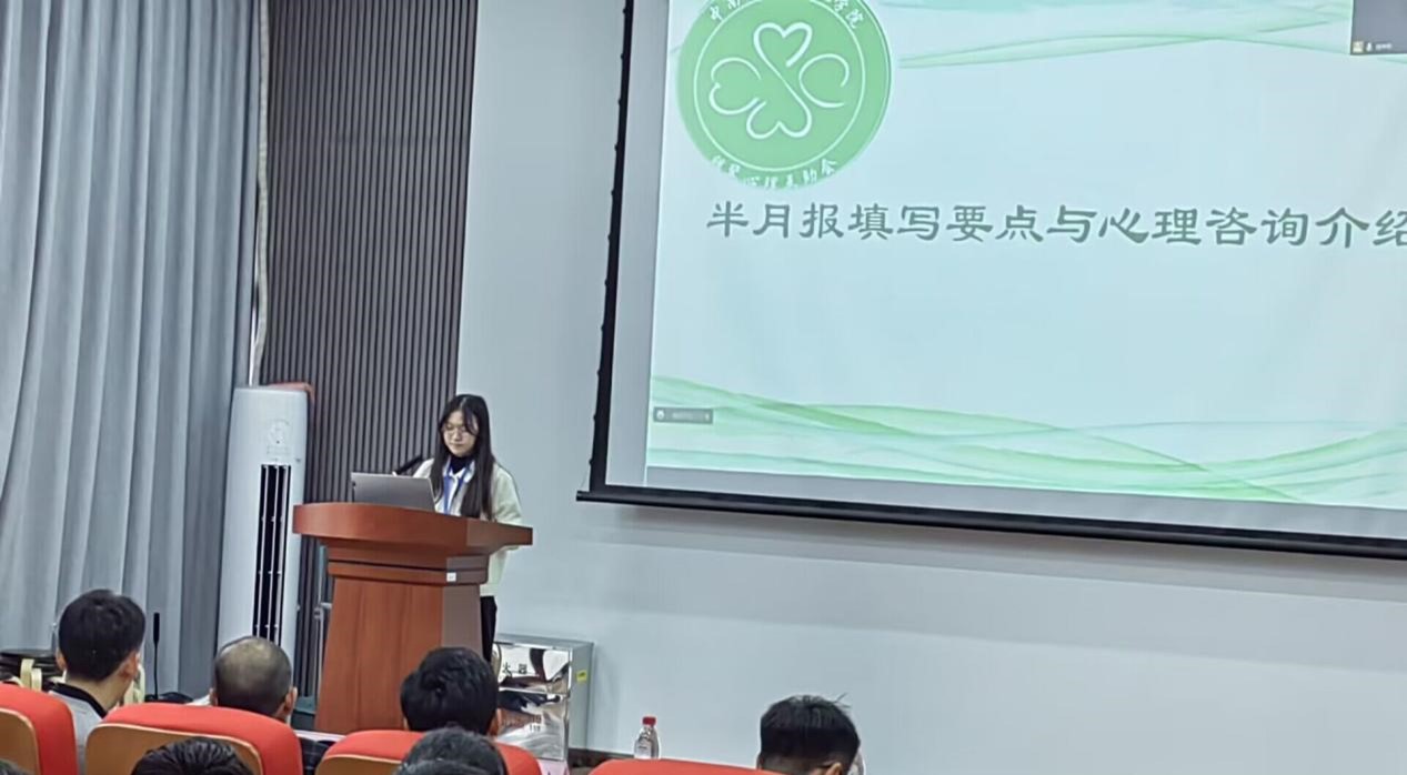 心理专干何星霖老师上台致辞。何老师肯定了过去一段时间各位心理委员在心理健康工作方面所做的贡献,但是同时也指出目前工作中仍存在如半月报填写不规范、不真实、疏忽马虎等共性问题,强调心理委员工作应当更加认真、负责、扎实。